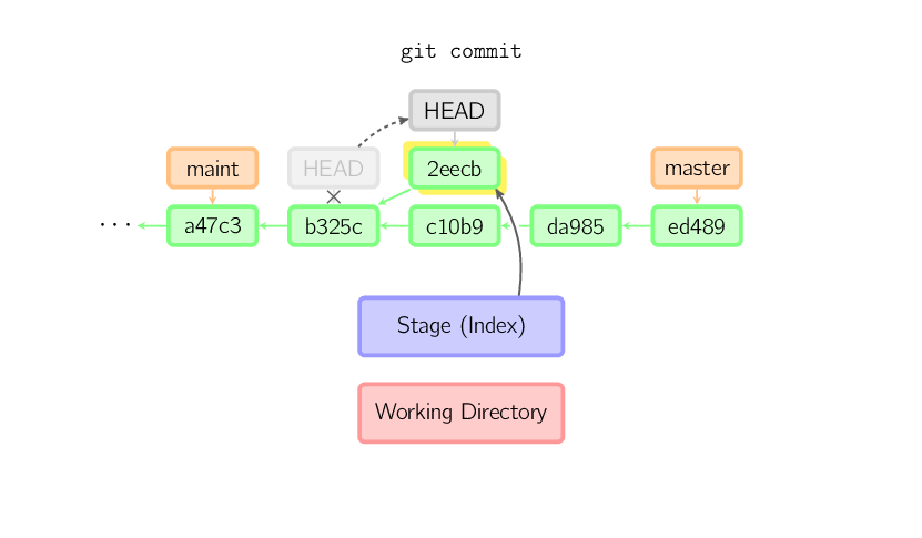 绿色的5位字符表示提交的ID,分别指向父节点。分支用橘色显示,分别指向特定的提交。当前分支由附在其上的HEAD标识。 这张图片里显示最后5次提交,ed489是最新提交。 master分支指向此次提交,另一个maint分支指向祖父提交节点。