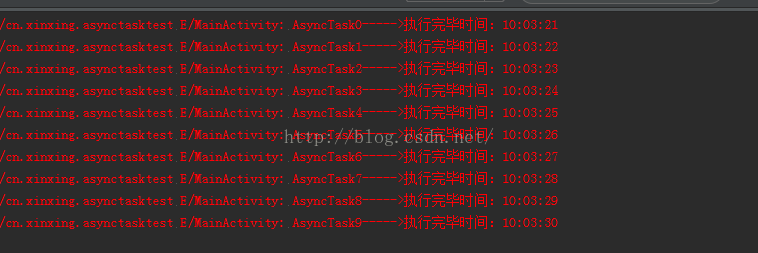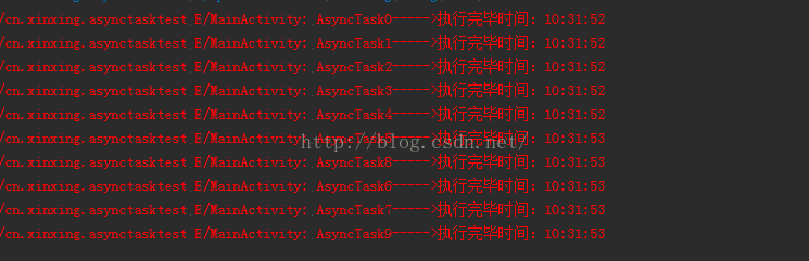 可以看到当点击按钮时,同时执行了10个AsyncTask,这10个AsyncTask是串行运行的,按顺序一个一个执行。