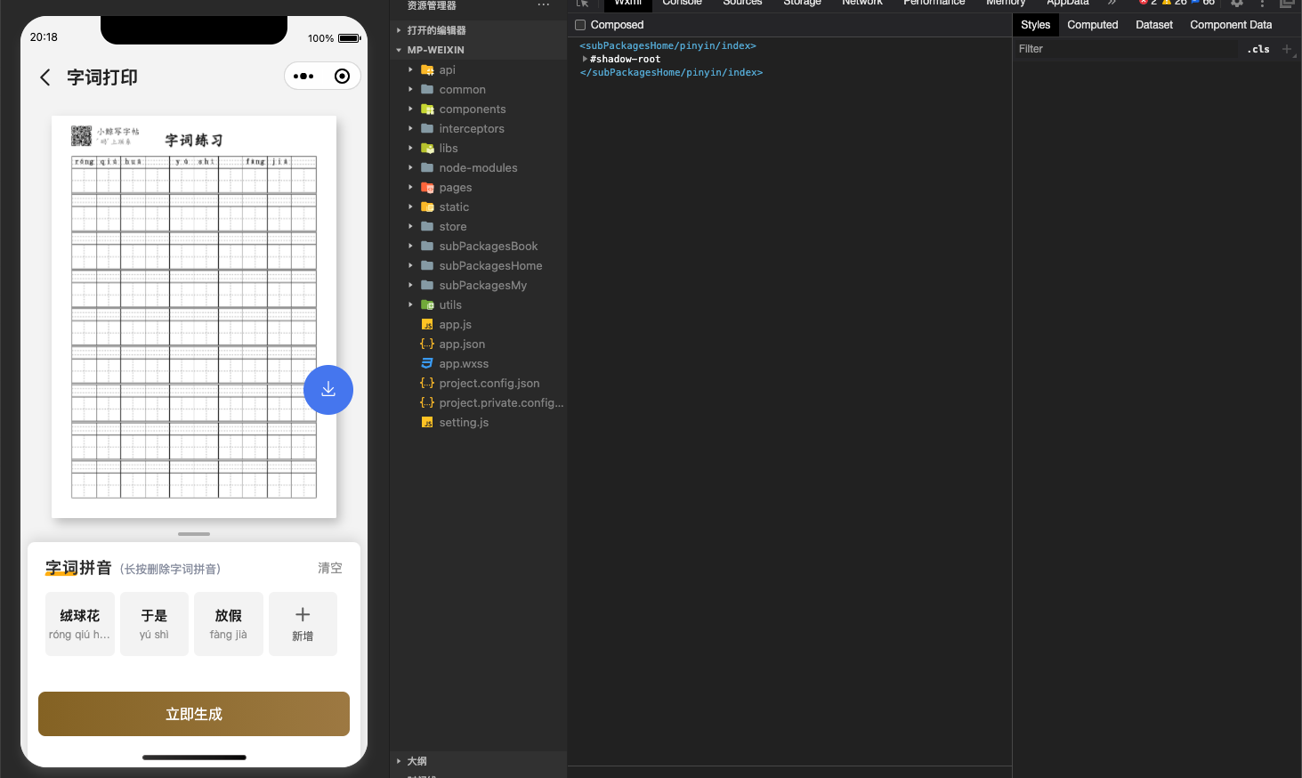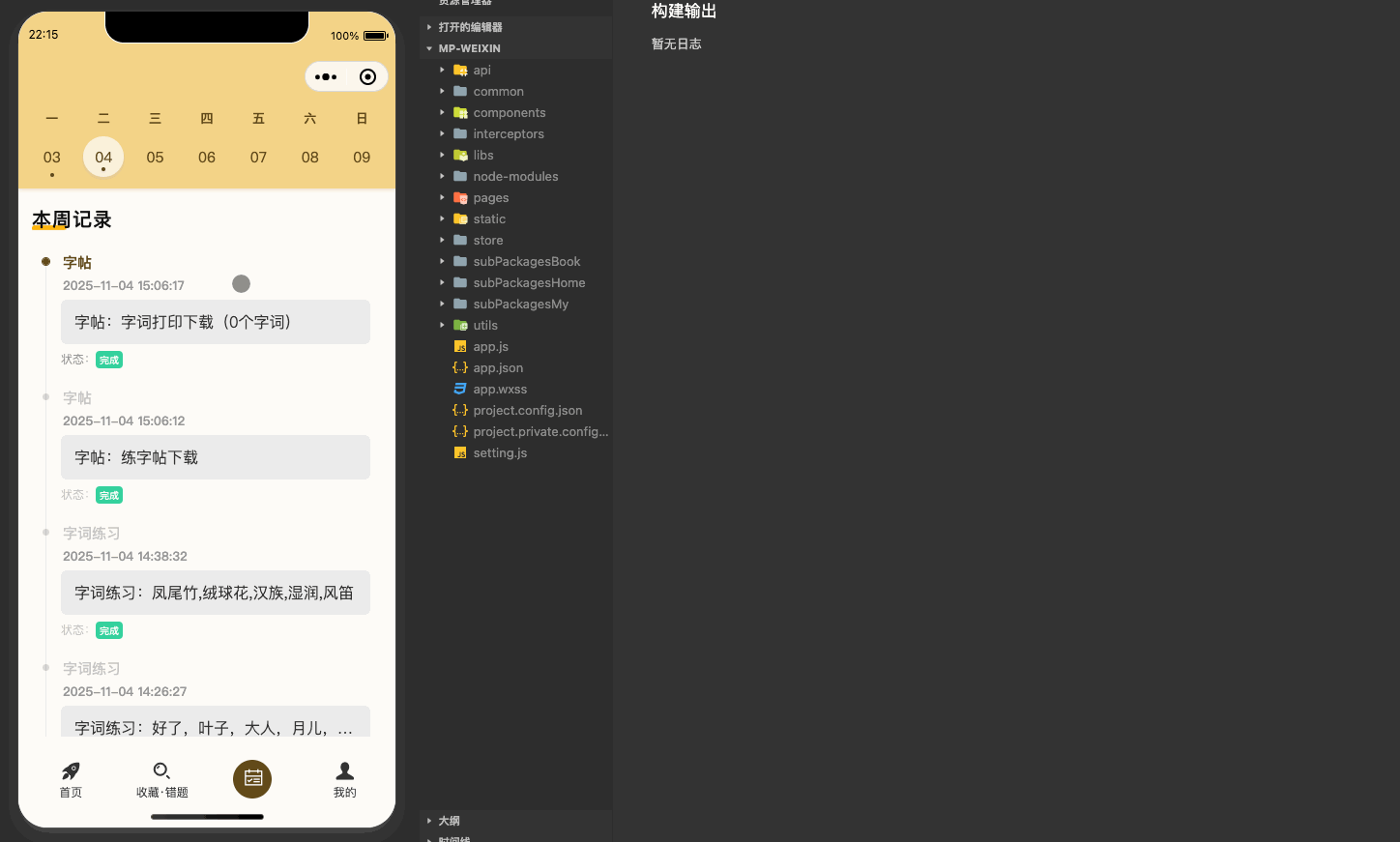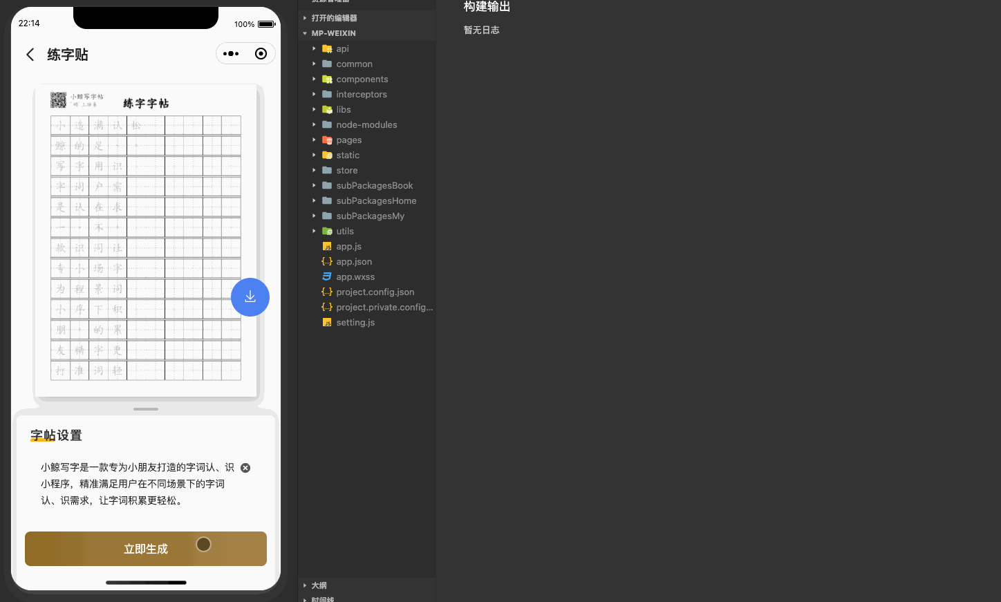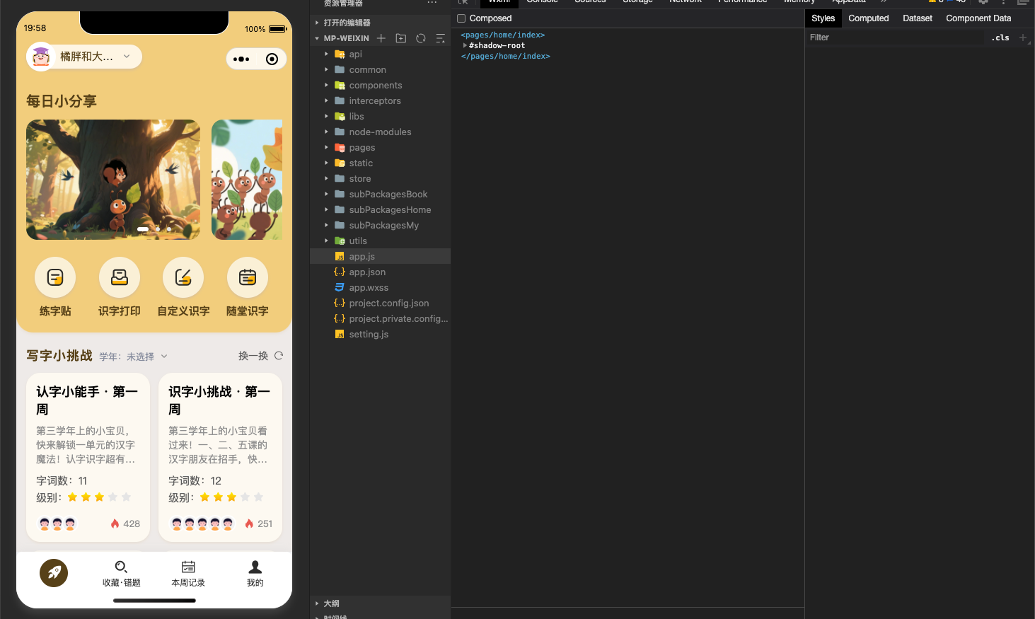 下面的效果图均从开发者工具直接截取,呈现的是真实开发状态,而非经过美化的 UI 示意图。(PS:受 CSDN 平台图片大小限制,部分图图片可能存在不清晰的情况,若想体验完整效果,欢迎直接到「小鲸写字」小程序内查看~)