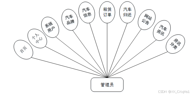 基于汽车租赁系统的设计基于现有的手机,可以实现管理员:用户管理、汽车分类、汽车品牌、汽车信息、汽车租赁、汽车归还等详细的了解及统计分析。根据系统功能需求建立的模块关系图如下图: