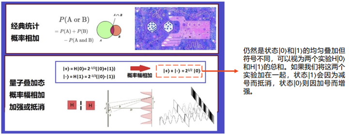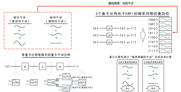 量子干涉(Interference):量子干涉是量子比特的波动性和相位差所产生的效应。在量子计算中,干涉用于增强正确答案的概率,同时减少错误答案的可能性。可以想象,量子比特的不同状态就像水波的波峰和波谷,通过调整这些波的相位,可以让某些状态的概率增大,而让其他状态的概率减小。通过这种干涉效应,量子计算能够高效地筛选出最优解,从而加速复杂问题的求解。