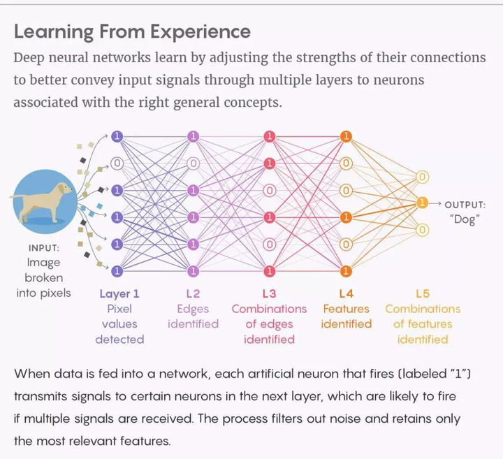 需要注意的是,神经元之间的连接需要经过反复试验进行调整,不是预先确定的。例如,给神经网络输入带有“小猫”或“小狗”标签的图像。网络会给每一张图像分配一个标签,检查是否匹配正确,如果不正确就调整神经元连接。刚开始时网络的预测是随机生成的,但是其准确度会越来越高;在经过1000个实例的训练之后,网络将能识别图像中的宠物。正规的神经网络可能拥有10亿个神经元连接,所有连接都需要进行调整。
