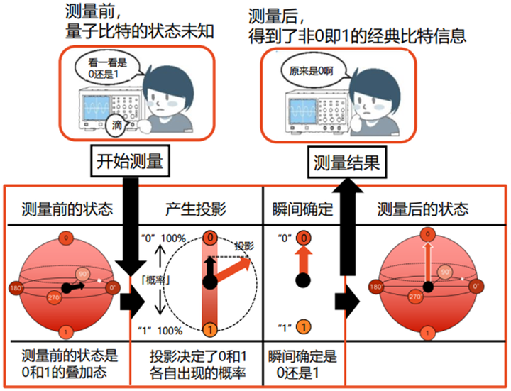 类似于地球经纬度, 布洛赫球面点常以振幅+相位物理量定坐标。 量子比特一经测量, 就会通过概率来决定到底是处于状态0还是状态1。 二者的概率均取决于测量前指向布洛赫球球面上某一点的箭头在贯穿0和1两点的轴上的投影。 箭头的投影越接近0, 出现0的概率就越大; 越接近1, 出现1的概率就越大。 经过测量后, 我们就可以从量子比特中读取非0即1的经典比特信息。 量子比特的状态此时也会变为与测量结果对应的状态0或状态1。