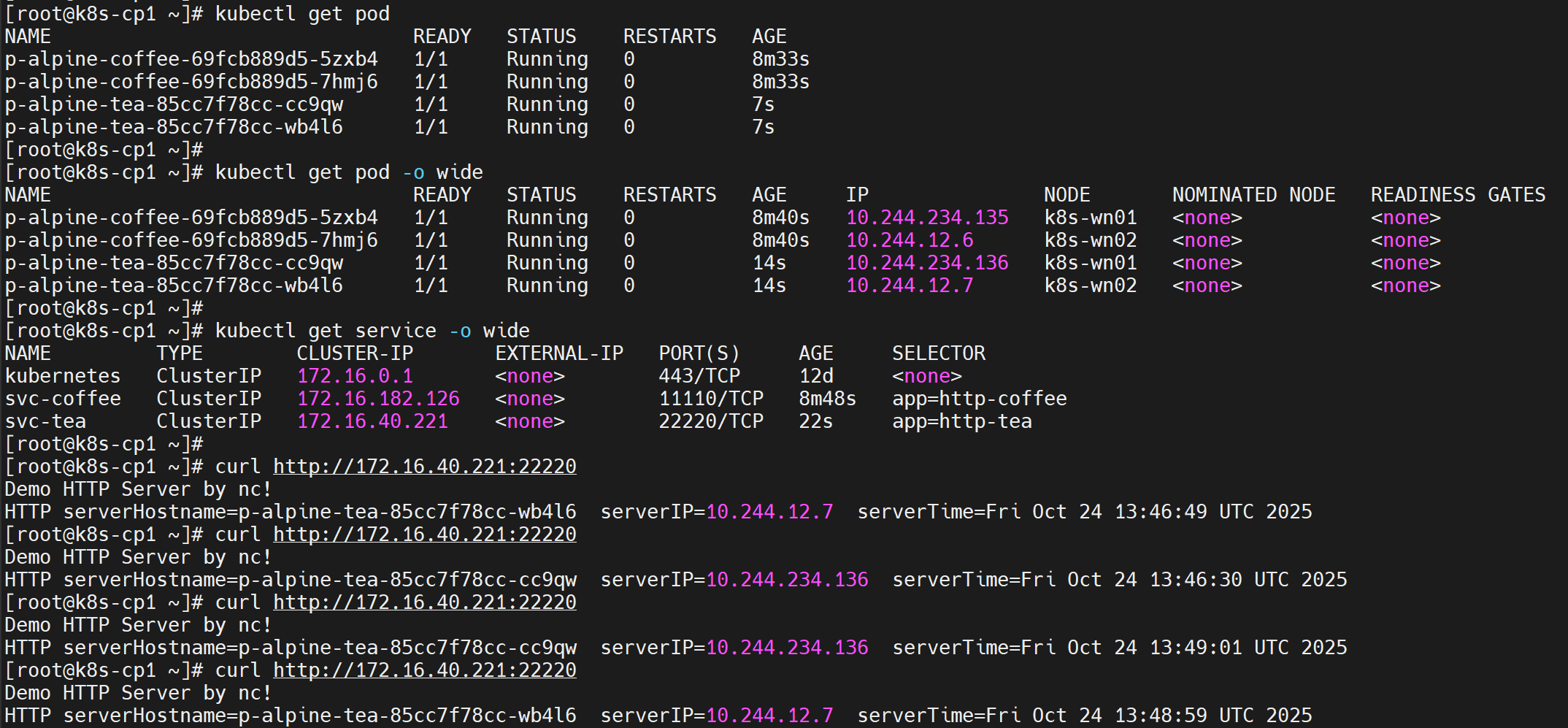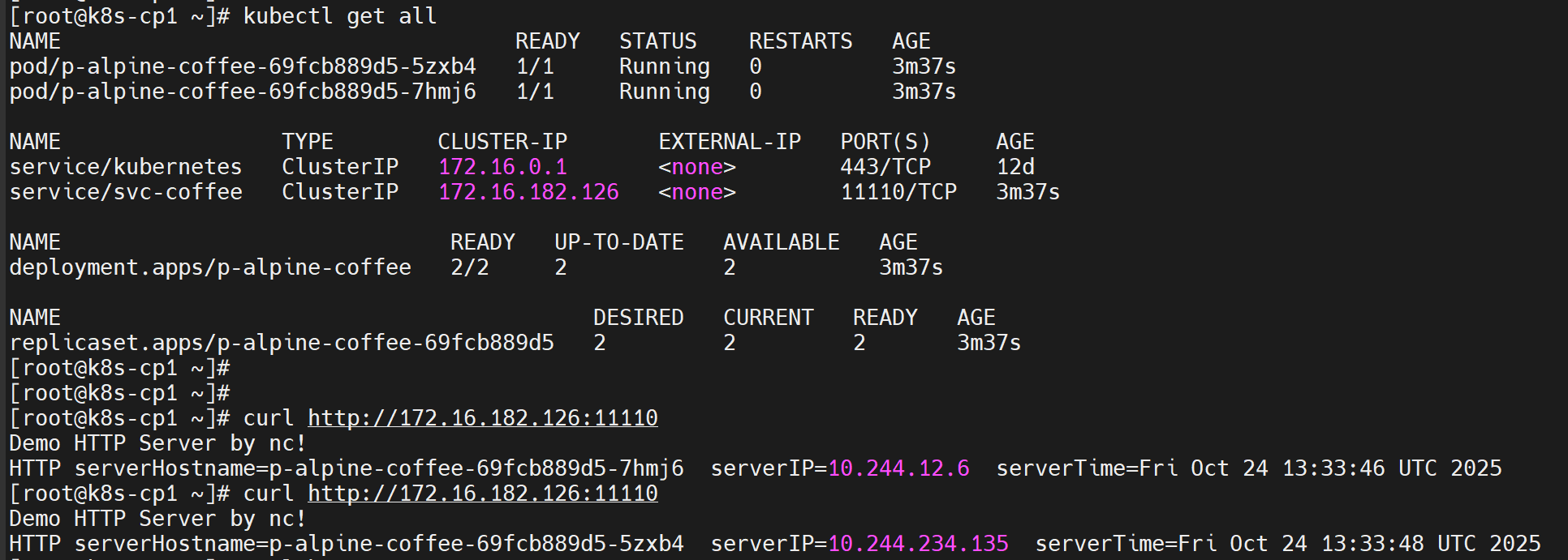 4、创建后,可以看到直接通过其Service访问,应答分别是由不同的Pod(容器)返回的: