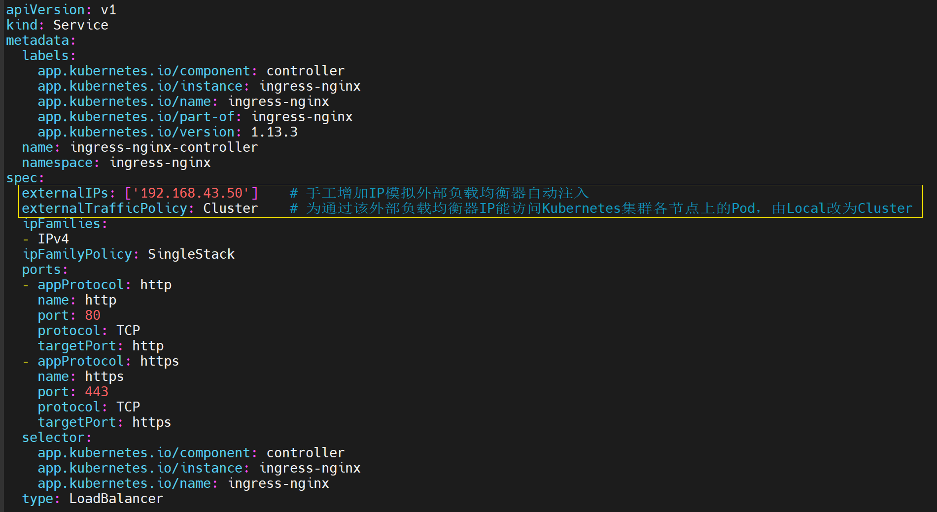 针对模拟方式第2步,在yaml清单文件中对“ingress-nginx-controller”的Service配置下,新增externalIPs、调整externalTrafficPolicy配置:
