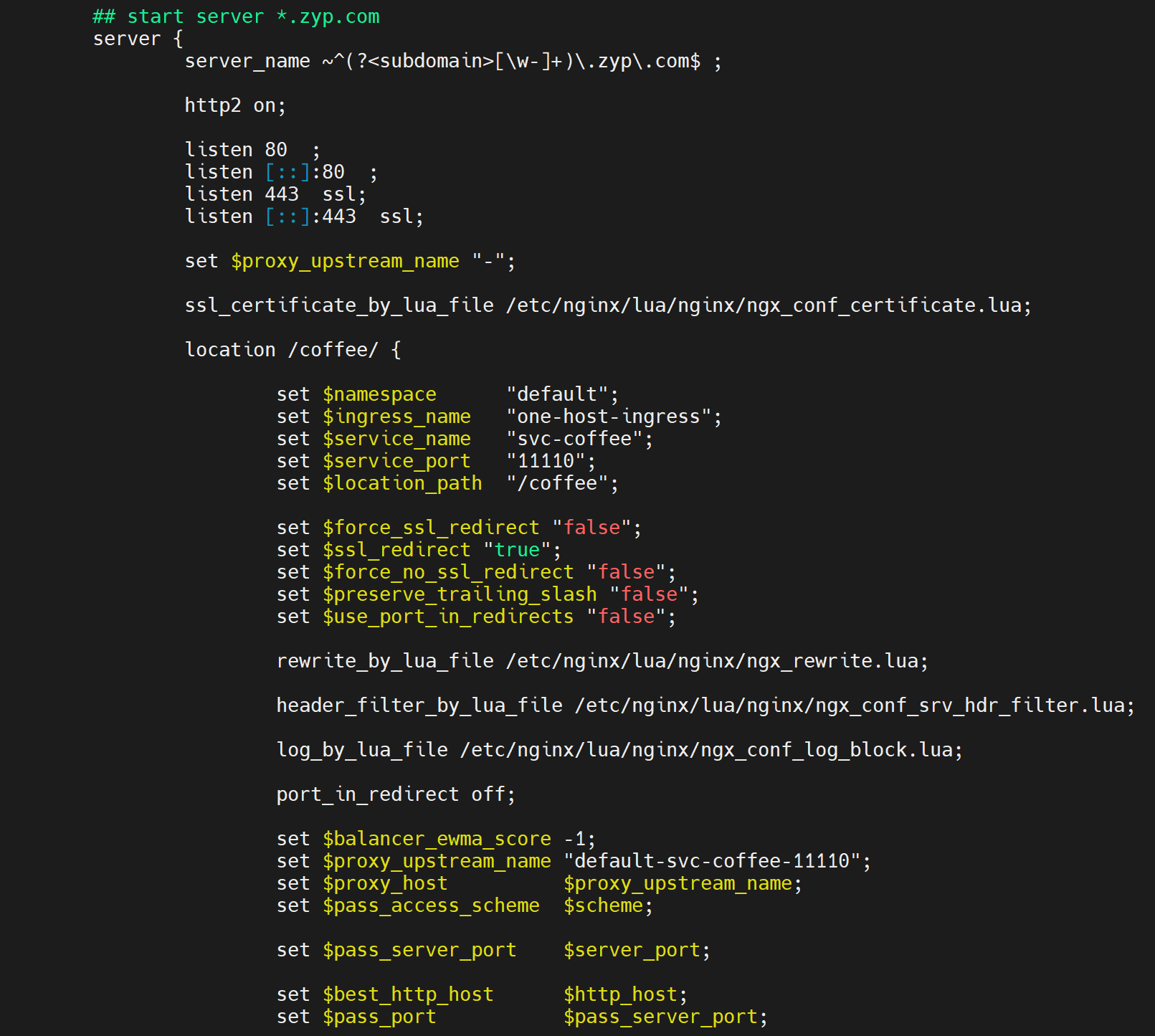 可以看到根据Ingress中定义的规则,已自动写入到nginx.conf文件中。这就是“Ingress NGINX Controller”这款对Ingress定义规则的具体实现方式。