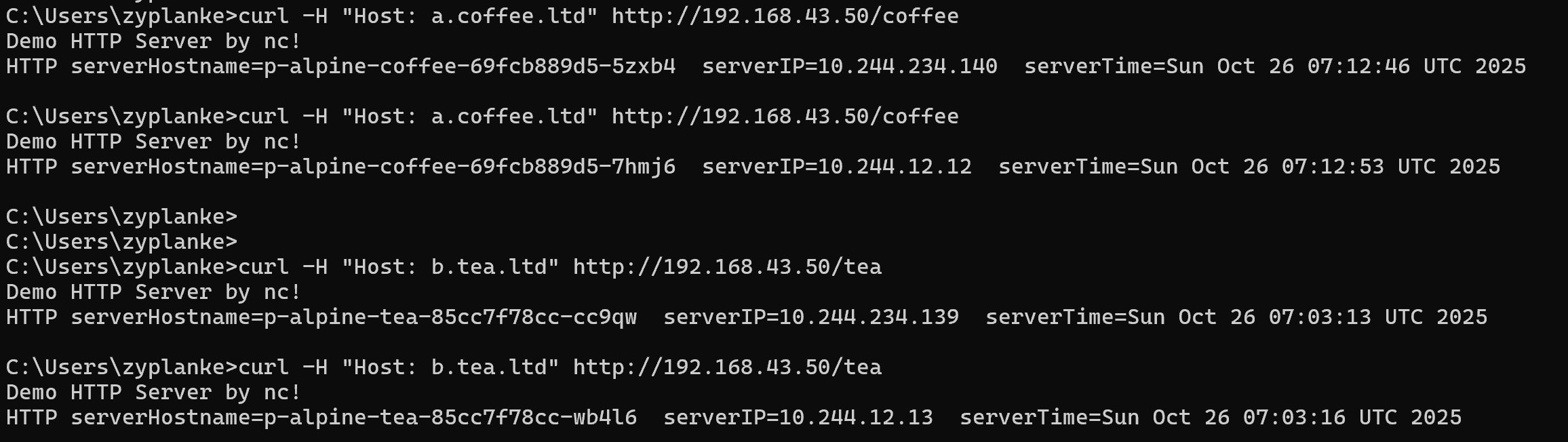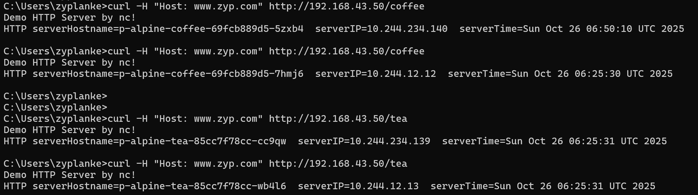 注2:curl或者浏览器默认会根据请求URL中内容自动设置Host请求头。但由于本环境中没有对外部负载均衡器配置DNS域名,因此在URL中只能写IP,对此需要手工设置HTTP请求头以便通过Host与Ingress规则匹配。