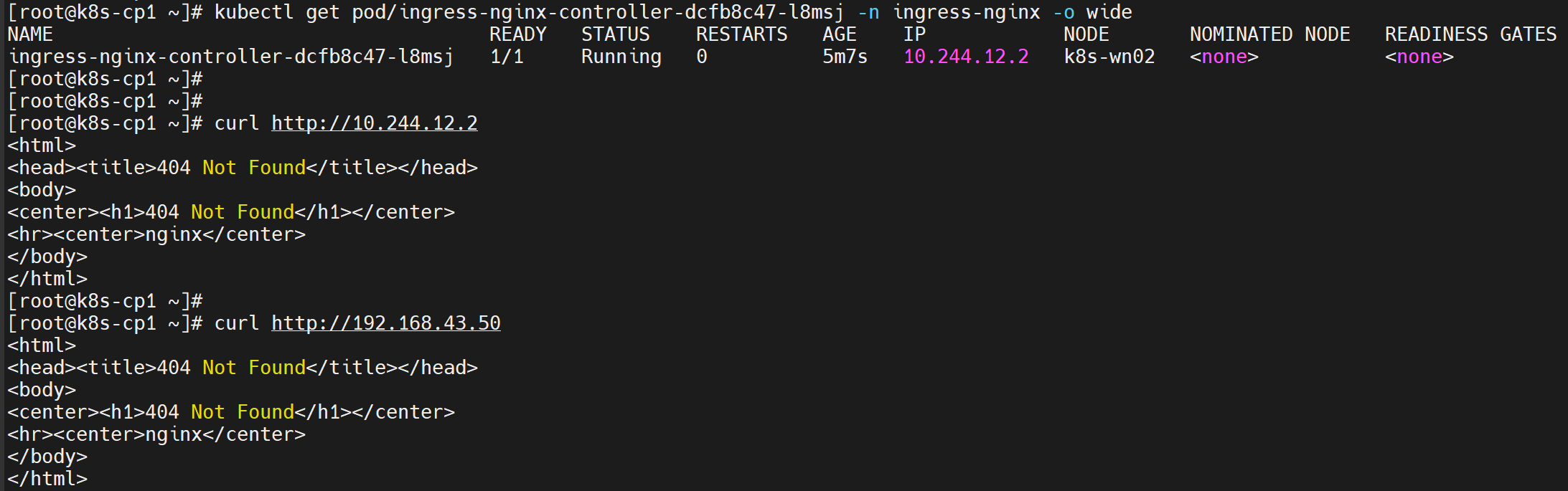 查看Pod并访问该Pod,可以看到Nginx的应答。由于此时还为配置Ingress的分发规则,因此HTTP返回的是Nginx自身,而不是后端服务(更准确说Pod中容器)返回的应答。