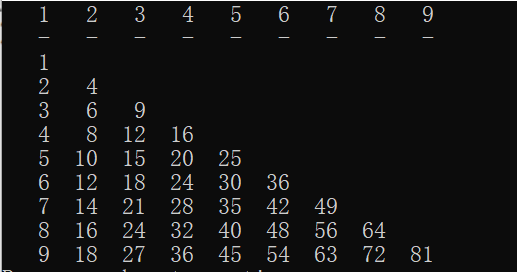 C语言写九九乘法表 #include<stdio.h>int main(void){ int i,j; for(i=1;i<=9;i++) printf("%4d",i); printf(""); for(i=1;i<=9;i++) printf(" -"); printf(""); for(i=1;i<=9;i++) { for(j=1;j<=i;j++...