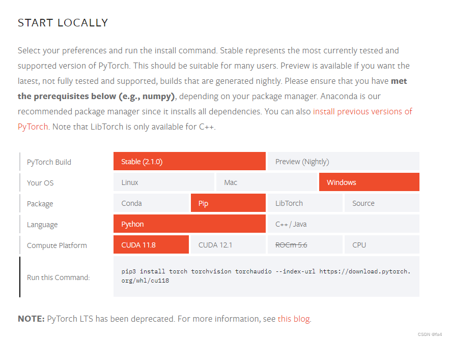 在命令行输入nvidia-sim,查看自己的CUDA版本号,进入pytorch官网Start Locally | PyTorch,查看能否支持最新的CUDA版本(自己的CUDA版本一定大于pytorch的CUDA版本),如果不能就使用pytorch其他版本。