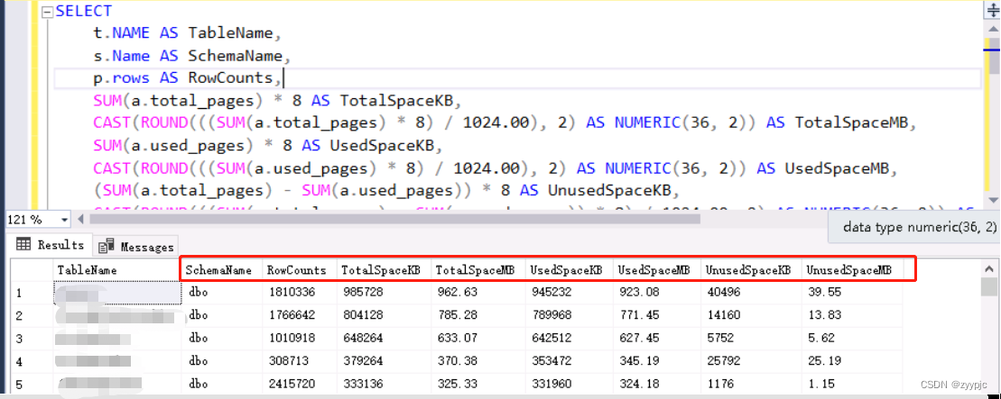 CAST(ROUND(((SUM(a.total_pages) * 8) / 1024.00), 2) AS NUMERIC(36, 2)) AS TotalSpaceMB,