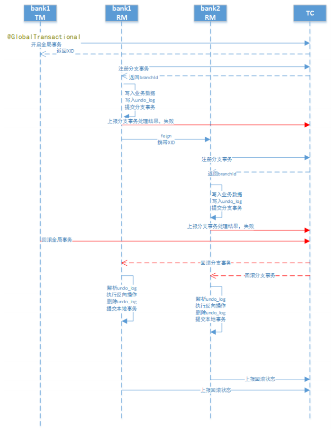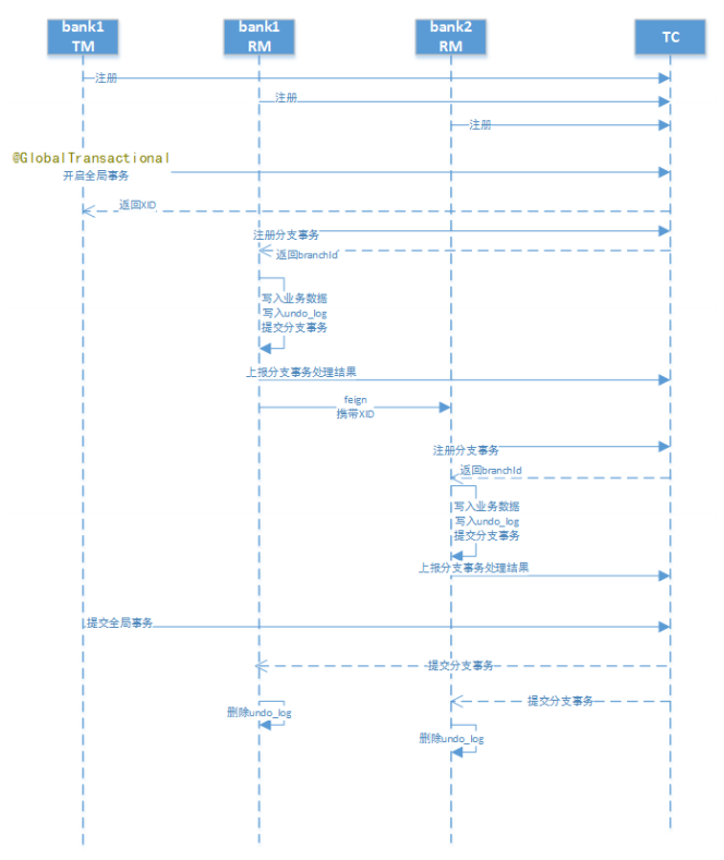 两个账户在三个不同的银行(张三在bank1、李四在bank2),bank1和bank2是两个个微服务。交易过程是,张三给李四转账指定金额。