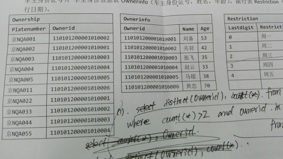 select Platenumber,o1.Ownerid,Namefrom Ownership o1,Ownerinfo o2 whereo1.Ownerid=o2.Ownerid and substring(Platenumber,-1)=(select Lastdigit fromRestriction where Restriction='周三') group by Ownerid;