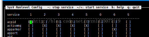 对于修改自启动服务,可以将光标移动到activemq那行的第2列,按点击鼠标或者空格进行将启动项反选(启动项的修改),按q退出之后配置即完成。