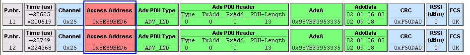 对于广播信道,接入地址是固定值“0x8E89BED6”,抓包显示如下: