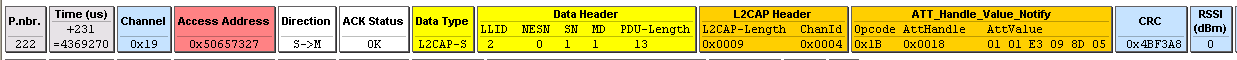 注意上述截图中“Data Header”中的“PDU-Length”显示的是十进制,也就是上述截图中实际净荷长度是13个字节即“L2CAP Header”和ATT部分实际长度是13个字节,而“L2CAP Header”中的“L2CAP-Length”是十六进制,表示的是后面ATT部分的实际数据长度,图中为9个字节,抛去ATT的Opcode和AttHandle占用了3个字节之外,剩下的AttValue刚好是6个字节。