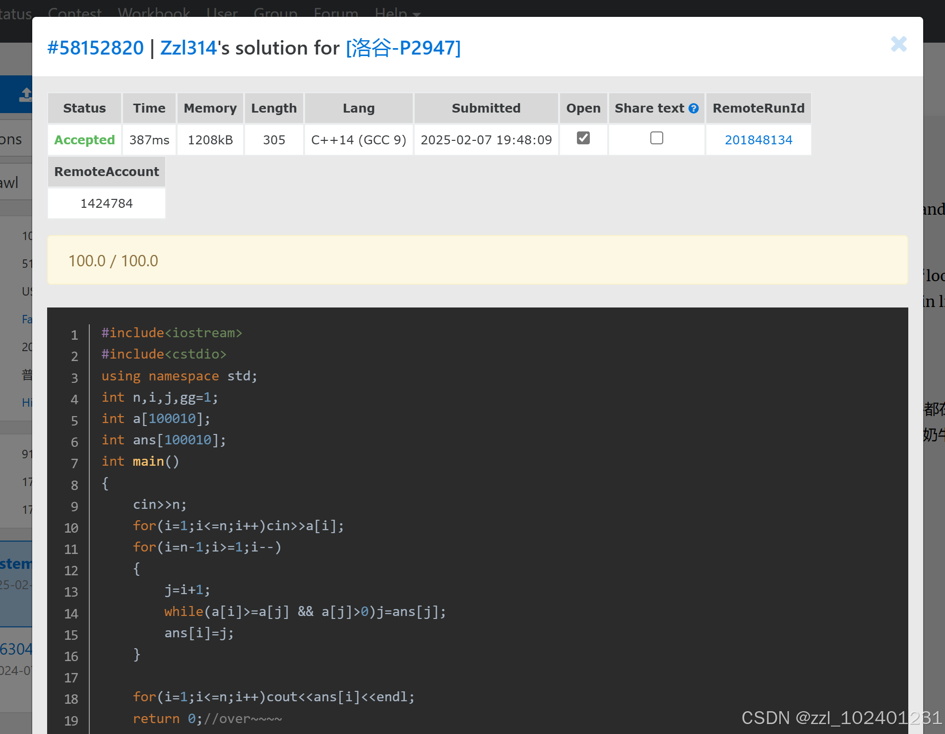 可以构建一个单调递减栈。每次输入一个数a就while判断a是否比原来栈顶的数大。如果比栈顶的数大就证明这个a是之前栈顶数的仰望对象,记录它的仰望对象并将原来栈顶的数出栈。之后再将a进栈。最后将记录的仰望对象输出。