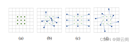 (b)是可变形的卷积,给每个采样点加一个offset(这个offset通过额外的卷积层学习得到),排列变得不规则。