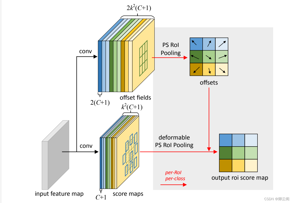 额外的conv层来学习offset,共享input feature maps。然后input feature maps和offset共同作为deformable conv层的输入,deformable conv层操作采样点发生偏移,再进行卷积。