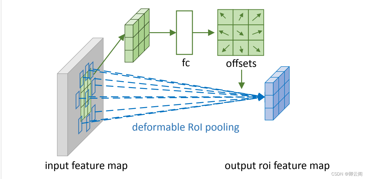 由于按照RoI长宽比例进行水平和竖直方向偏移,因此每一个bin的偏移量只需要一个参数来表示,具体可以用全连接来实现。