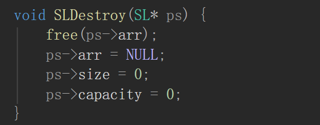 动态顺序表的数组是通过malloc动态开辟的,使用完后必须手动释放,否则会造成内存泄漏。销毁操作的核心是释放动态开辟的空间,然后将指针、size、capacity重置。