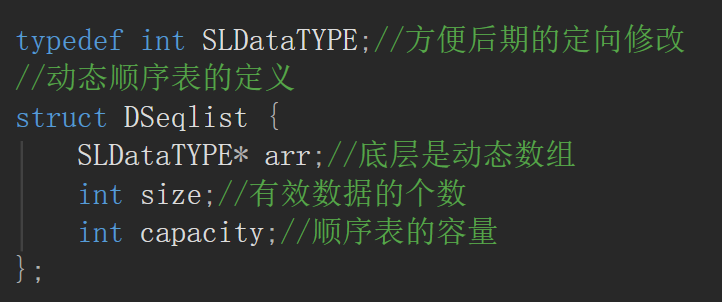 动态顺序表的核心是通过指针指向动态开辟的数组,同时记录当前存储的数据个数(有效长度)和数组的最大容量,结构定义如下: