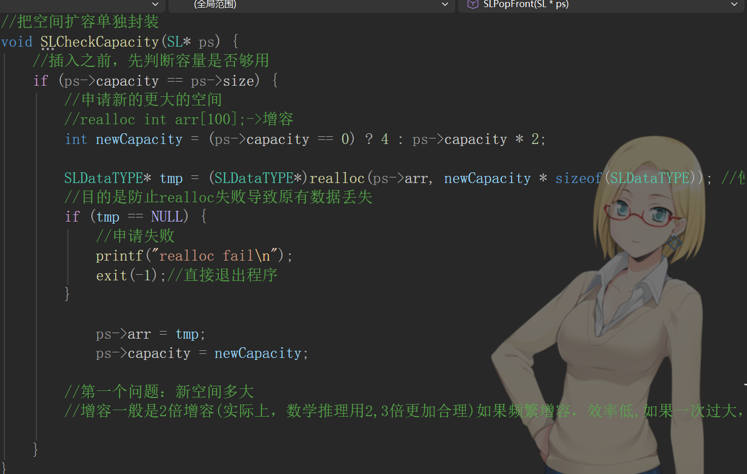 扩容失败:realloc可能会开辟空间失败(返回NULL),必须检查返回值,否则会导致原空间地址丢失,造成内存泄漏。