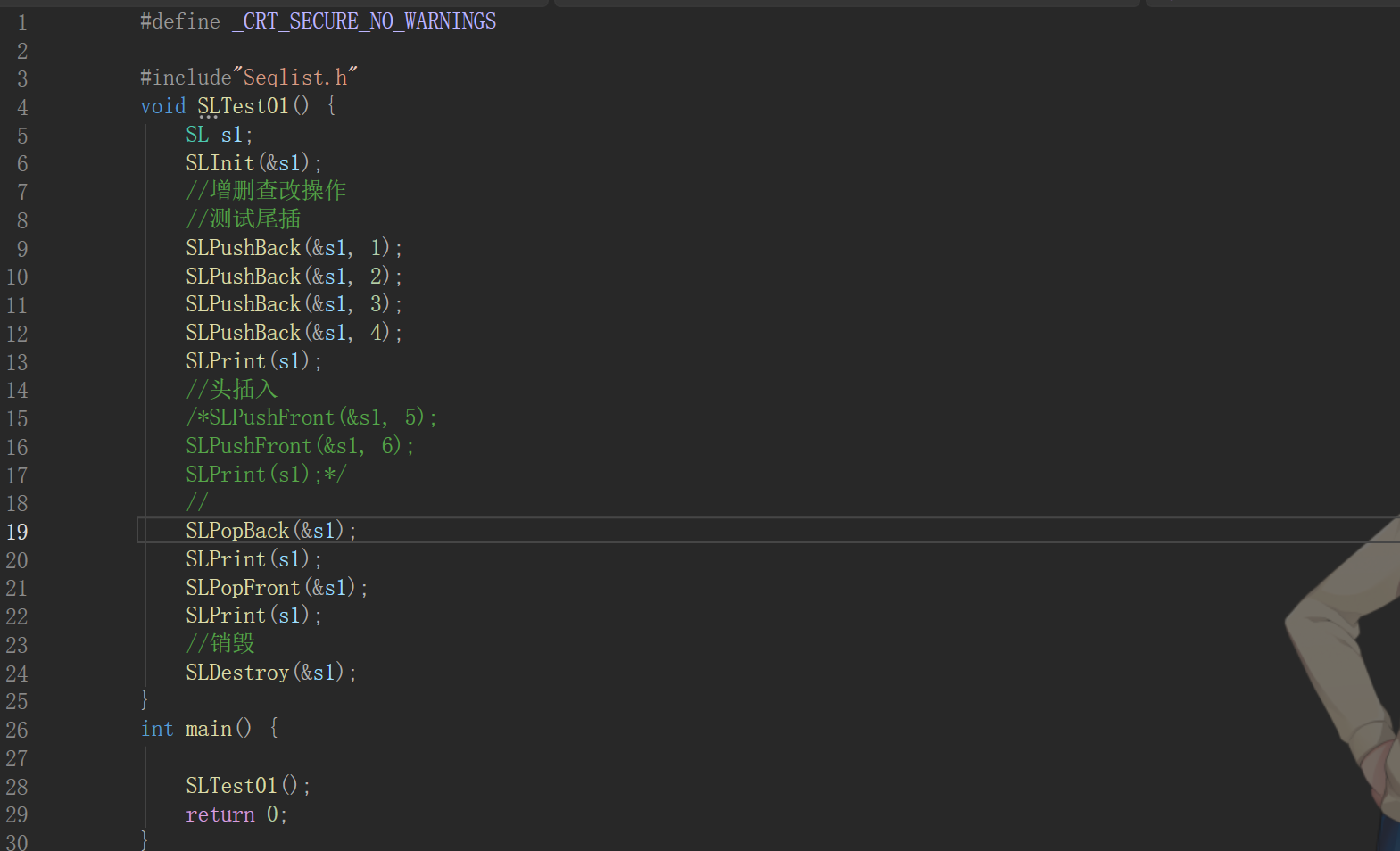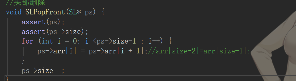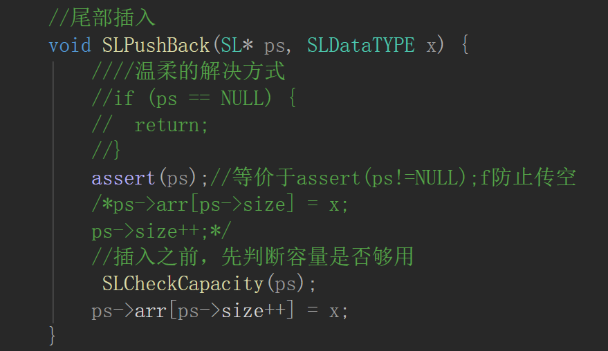 💡 注意:必须传入结构指针(SL* ps),如果直接传结构体变量,会进行值拷贝,修改的是拷贝后的变量,原顺序表不会发生变化。assert断言在Debug模式下生效,Release模式下会被忽略,用于调试时检测空指针。