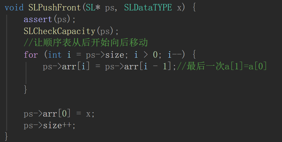 头部插入即在顺序表的第一个位置添加新数据,步骤:先检查容量,然后将所有有效数据从后往前依次向后移动一位(避免覆盖数据),最后将新数据存入0位置,size自增1。