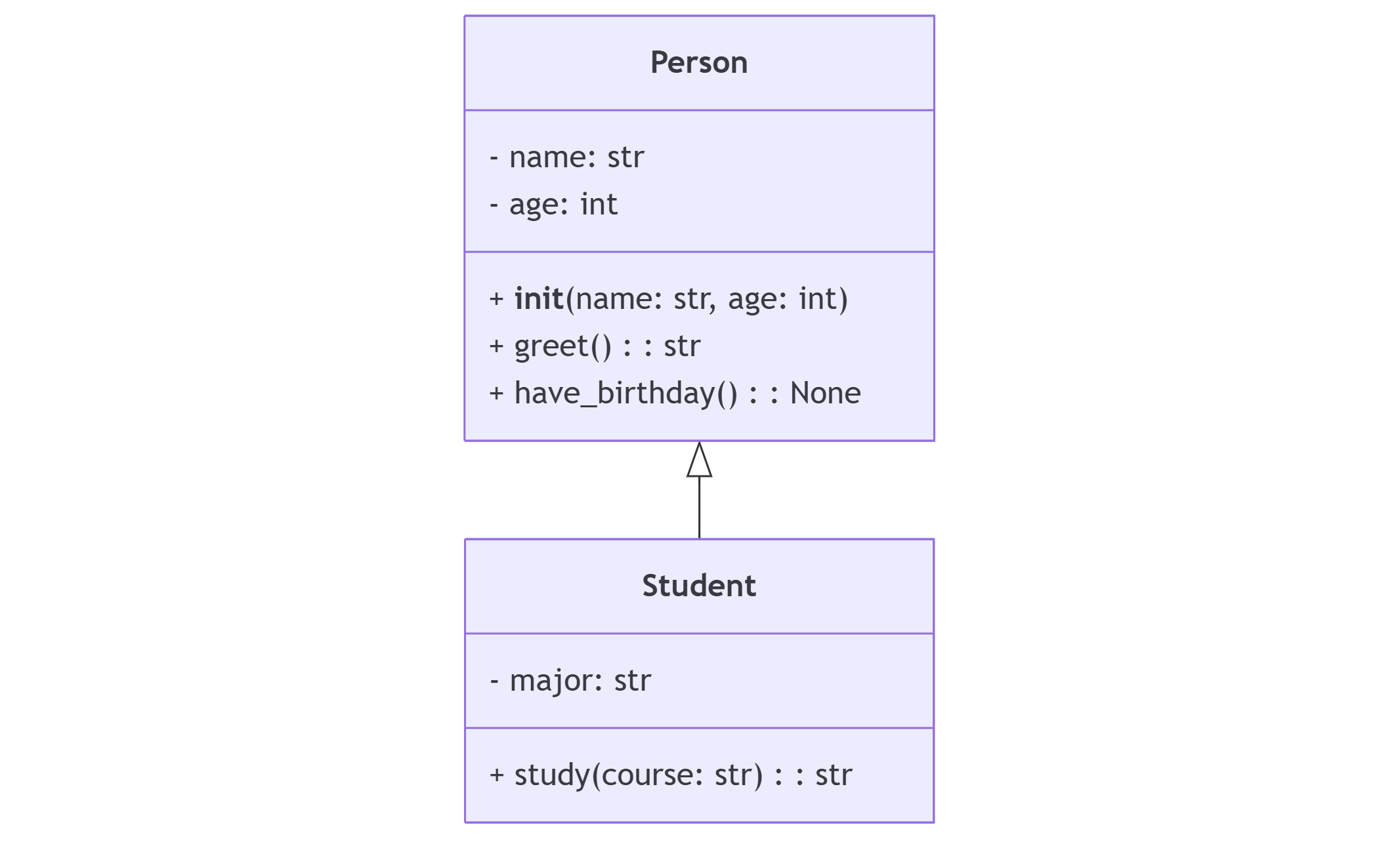 classDiagram class Person { - name: str - age: int + __init__(name: str, age: int) + greet(): str + have_birthday(): None } Person <|-- Student class Student { - major: str + study(course: str): str }