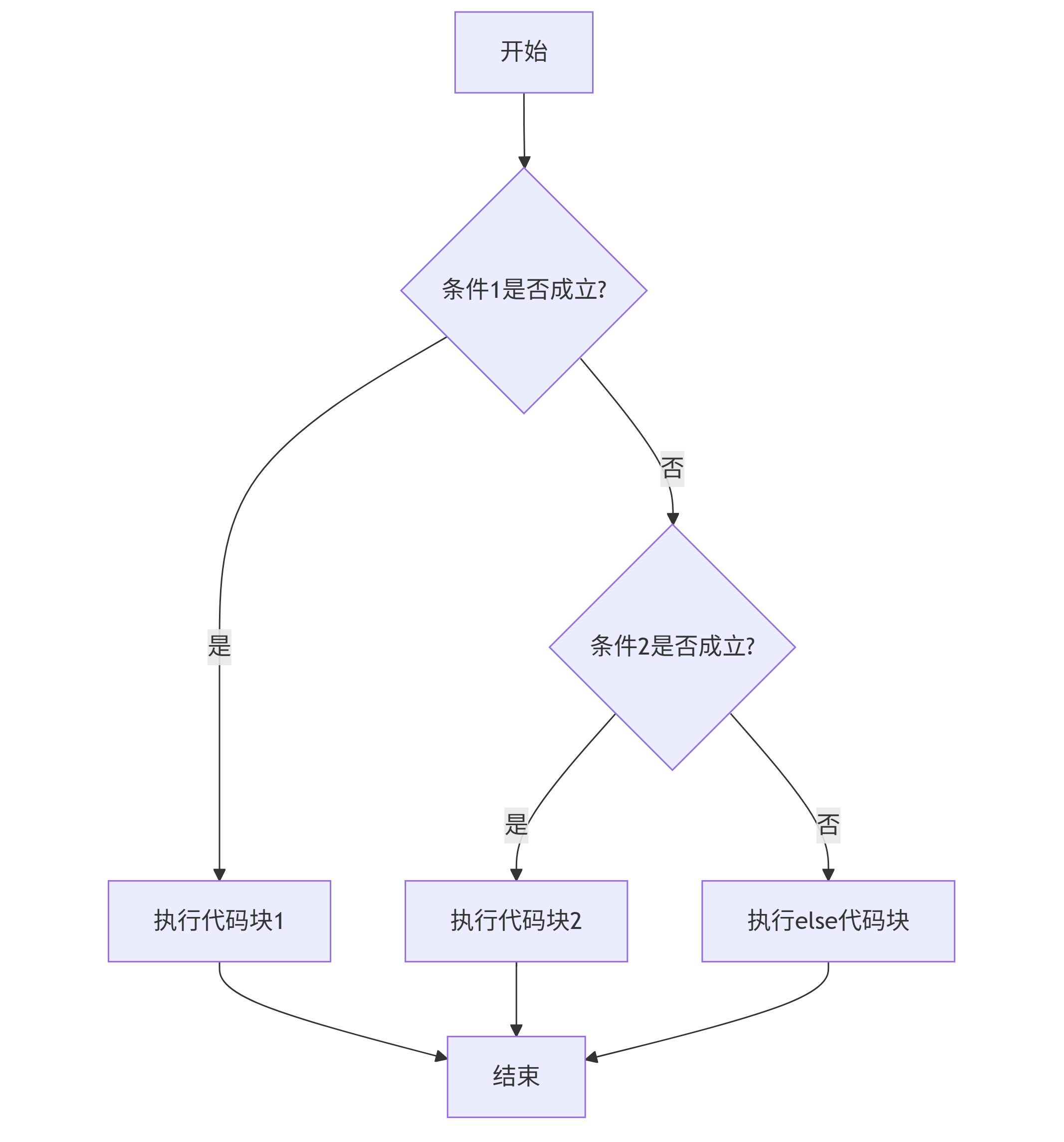 flowchart TD A[开始] --> B{条件1是否成立?} B -- 是 --> C[执行代码块1] --> E[结束] B -- 否 --> D{条件2是否成立?} D -- 是 --> F[执行代码块2] --> E D -- 否 --> G[执行else代码块] --> E