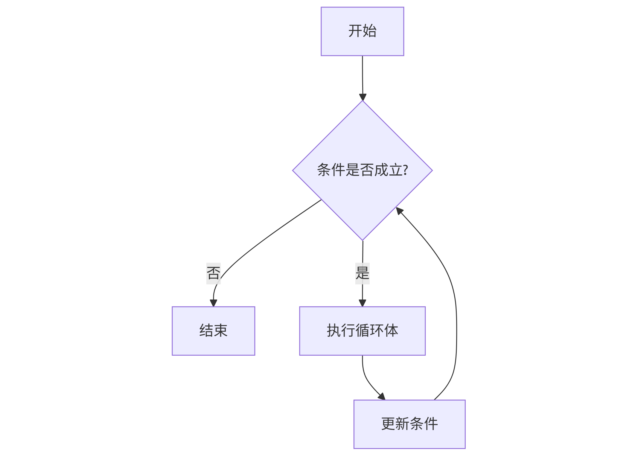 flowchart TD A[开始] --> B{条件是否成立?} B -- 否 --> C[结束] B -- 是 --> D[执行循环体] D --> E[更新条件] --> B