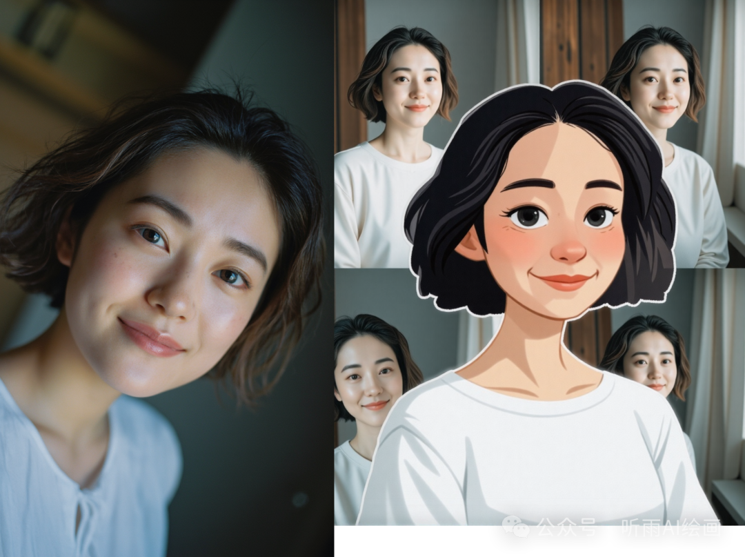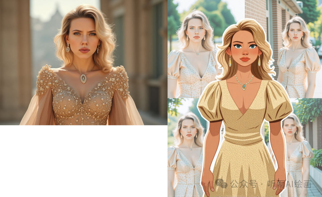 最近 Flux 社区有一个 Lora 比较火,叫做一键创意模版,可以生成背景是 4 张真实照片,但是中间的前景是一张卡通的插画照片的风格,而且卡通图片和真实照片的风格也很相近。