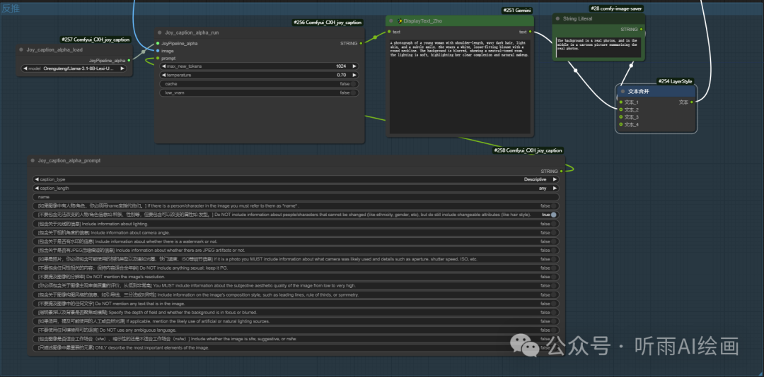 反推节点听雨这里换成了最近比较火的 joy_caption_two,没用原工作流中的 Ollama 节点,那个需要本地部署大模型,比较麻烦,还占显存。