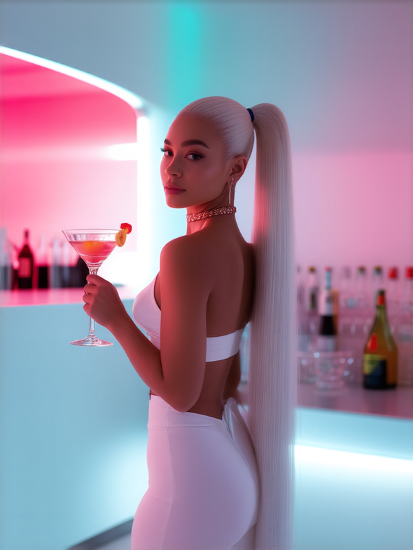 a sophisticated woman with a long ponytail, wearing a white crop top and tight skirt, holding a martini, pink ambiance, abstract lounge, neon