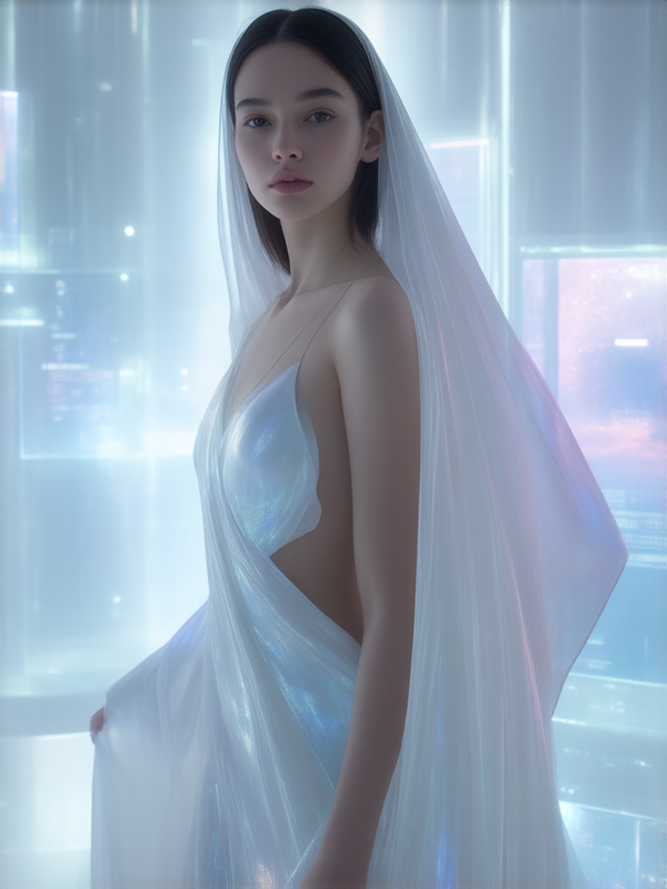 Ultra-realistic portrait of a woman in a futuristic environment, wearing a sleek white gown that shimmers like liquid glass. Behind her, floating holographic screens and futuristic architecture set the scene, glowing in soft pastel tones. Her gaze is calm yet intense, as if she’s navigating a digital world with elegance and precision. The lighting creates a glowing halo effect around her, and the intricate details of her gown contrast with the high-tech, minimalist background, blending beauty and innovation.