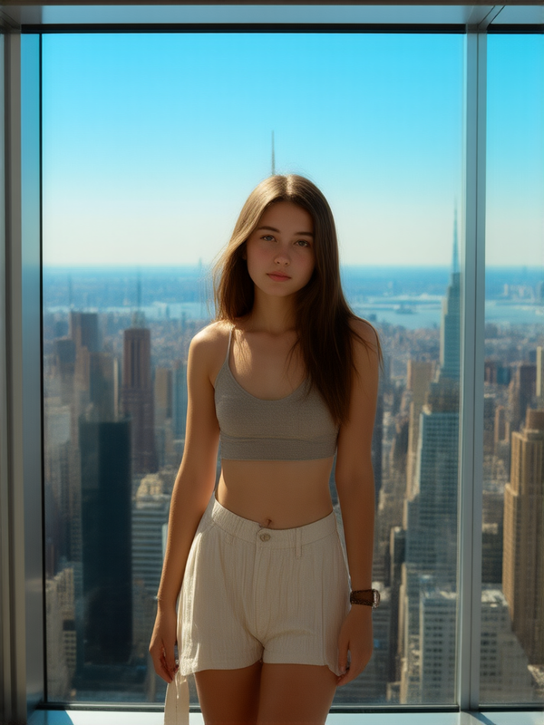 Photo of a young white woman with straight brown hair, wearing a summer outfit, standing at the top of The Edge in New York at midday. The sun is shining brightly in the clear sky, casting natural light on the scene. She is looking directly at the camera with a confident and serene expression. The modern glass panels of the observatory surround her, and the skyline of Manhattan is clearly visible in the background, with the skyscrapers sharply outlined against the bright blue sky. Her summer attire flutters slightly in the breeze, giving a relaxed and airy feeling to the image.