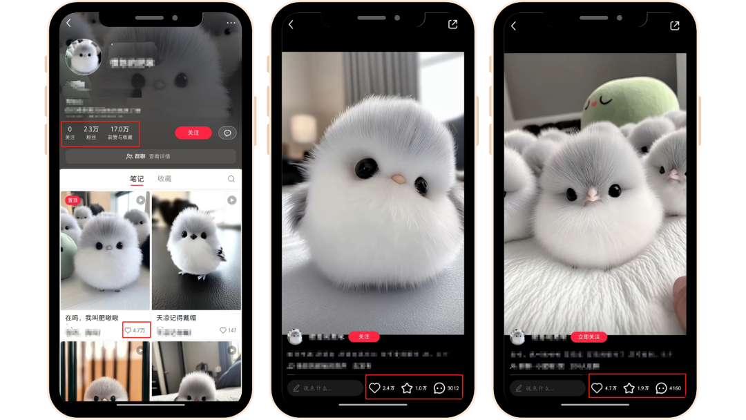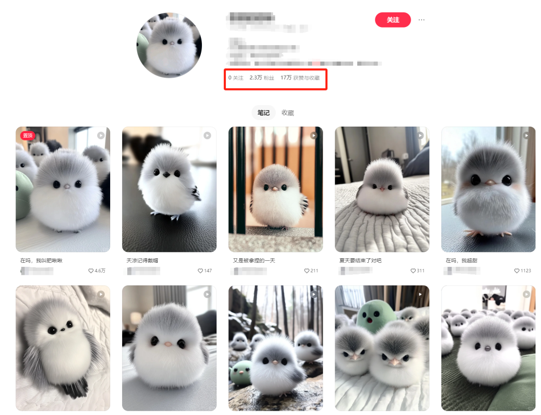 又比如说这个小红书账号,简直是个吸粉神器!**从8月15日开始累计上传了13条视频,粉丝数就噌噌噌涨到了2.3万,点赞和收藏加起来超过了17万。**特别是那条最火爆的视频,点赞数达到了惊人的4.7万。而且,因为AI制作的视频太逼真了,很多粉丝都被蒙在鼓里,以为那些毛茸茸的小鸟是宠物,还留言问能不能买,真是让人哭笑不得!