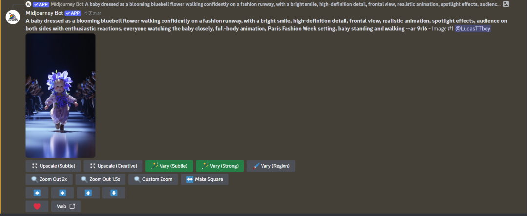 在Midjourney中生成AI宝宝走T台的图片,直接输入我图片提供的提示词,或者通过图生图的方式进行生成图片。