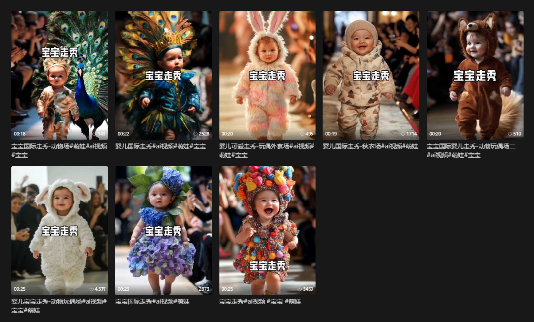 「 那么问题来了,这类型的账号为什么这么火呢?」 宝宝走秀视频之所以能迅速走红,是因为它们拥有萌态可掬的外表、灿烂的笑容和鲜艳的服装,这些元素深深吸引了粉丝。视频内容的可爱和精美设计,特别是能引起年轻父母和萌物爱好者的共鸣。同时,AI技术的应用使得视频画面质量高,风格独特,具有强烈的视觉吸引力。而且,制作这类视频的操作简单,即使是没有专业技能的普通人也能快速学会,制作出自己的热门视频。