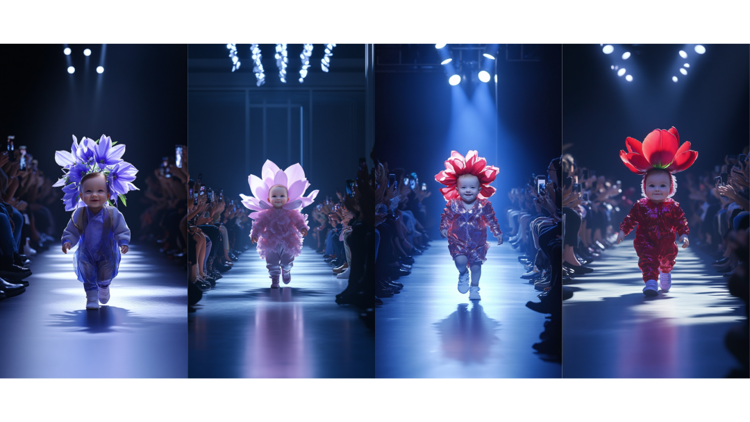 [Prompt:A baby dressed as a blooming bluebell flower walking confidently on a fashion runway, with a bright smile, high-definition detail, frontal view, realistic animation, spotlight effects, audience on both sides with enthusiastic reactions, everyone watching the baby closely, full-body animation, Paris Fashion Week setting, baby standing and walking --ar 9:16]