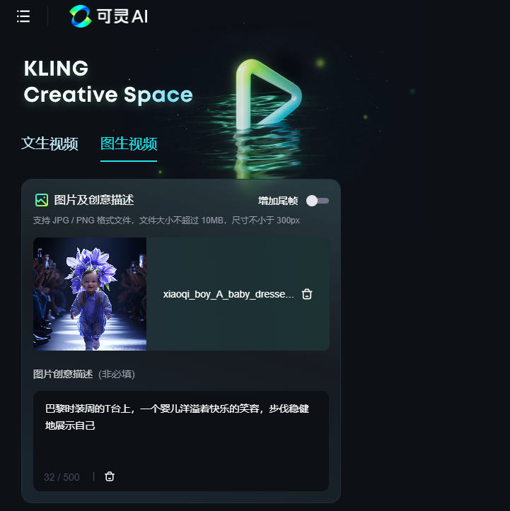 选好上面生成比较满意的图片,上传到可灵AI进行视频制作。描述栏里面写:**巴黎时装周的T台上,一个婴儿洋溢着快乐的笑容,步伐稳健地展示自己。**就这样批量的生成4-5个视频,可灵每天有66个灵感值,可以生成6个视频,绰绰有余了。